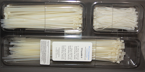 This 400 piece, all nylon, cable tie assortment kit is designed to hold cables securely. It comes with three different sizes to meet your needs. 4" Cable Ties: 200 pieces, MS3367-4-9, Bundle Dia. 1/16" - 7/8", Tensile Rating: 18lb/80n; 7" Cable Ties: 100 pieces, MS3367-1-9, Bundle Dia. 1/16" - 1 7/8", Tensile Rating: 50lb/222n; and 11" Cable Ties: 100 pieces, MS3367-7-9, Bundle Dia. 1/16" - 3 1/16", Tensile Rating: 50lb/222n. Temperature Rating: 185 Deg. F / 85 Deg. C